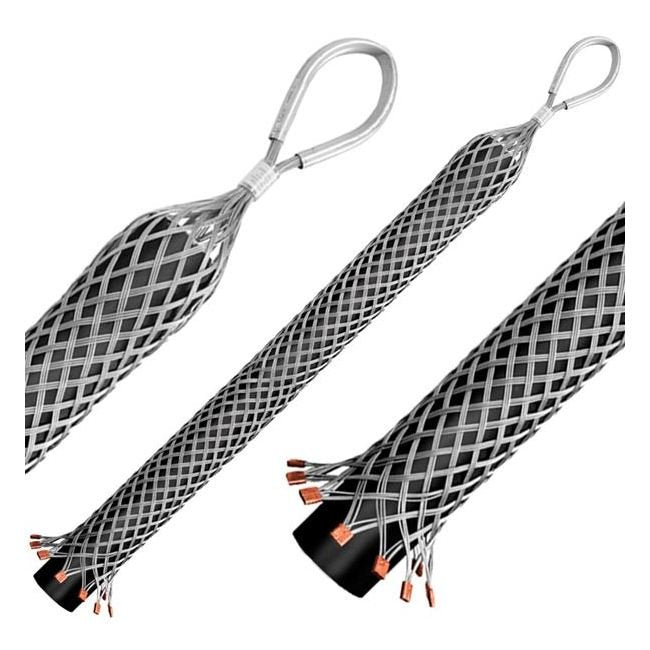 The Lewis 52 in. Mesh Triple Weave F Model Standard Pulling Grip is crafted from High-Fatigue Aircraft Strand steel cable with a UV resistant plastic coating for enhanced durability. This grip offers a work load of 6000 lb and an Ultimate Tensile Strength of 18000 lb. Featuring a Triple Weave design, aluminum eye, and copper tabs for reinforcement, this grip ensures secure and efficient wire pulling operations. The patented stress-relieving plastic tubing adds flexibility for inner conduit pulls, making installations and removals safer and easier.