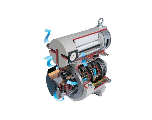 Ambient air is drawn through a filter into the compression chamber consisting of a stator in which an eccentrically arranged rotor revolves at 1,800 rpm. An air intake valve automatically adjusts incoming air volume to match your control scheme. The rotor has longitudinal slots in which the vanes slide. Zero-wear vanes ride on a thin film of oil and are held against the stator by centrifugal force. The air is compressed through the contraction in volume of each chamber formed by the vanes, the rotor and the stator wall. Sealing, cooling and lubrication are ensured by the oil injected into the chamber.