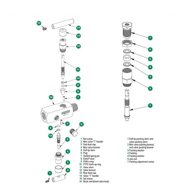 Soft SeatsPEEK (PK1)PCTFE (KF1)Packing PTFE (P1)Stem TipsNon-rotating (316 Stainless Steel) (T1)O-Rings (Other o-ring materials available on request)EPDM (EM1)FFKM (Perfluoroelastomer) 3018 or equivalent (KZ1)NBR (NB1)Handles1-13/16" Mini T-Handle (HL1)2-1/2" T-Handle (HL2)1" Round Knurled Handle (HL3)1-3/8" Phenolic Handle (HL4)1-3/4" Phenolic Handle (HL5)Cleaning For Oxygen Service (Stainless Steel Only)