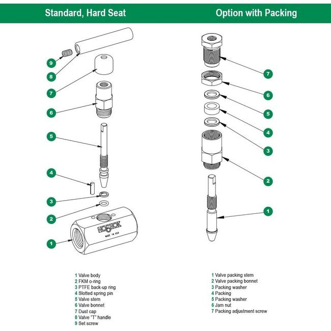 All 316 Stainless Steel stems with Fluorocarbon (FKM) o-ring and Polytetrafluoroethylene (PTFE) back-up ring below the threads, Polytetrafluoroethylene (PTFE) or Graphite packing optional for 1/4", 3/8" & 1/2" NPT only