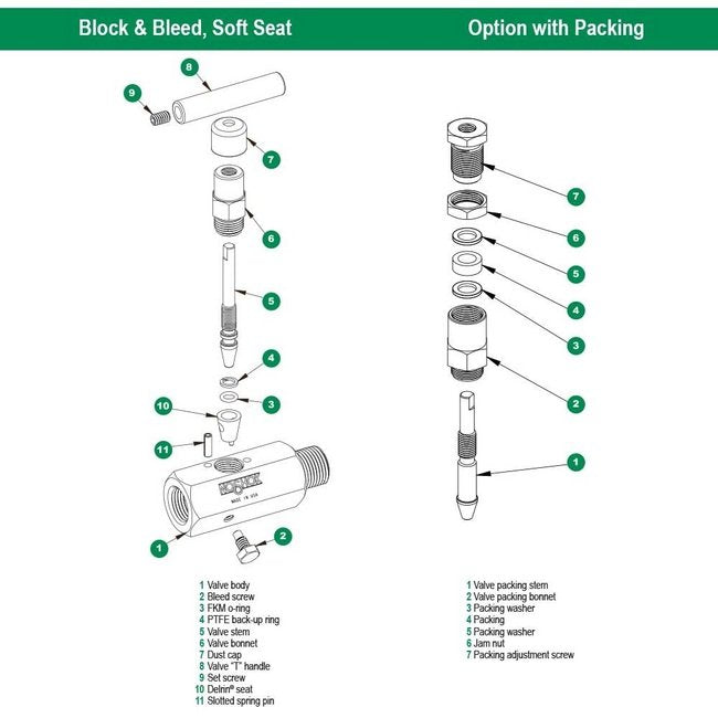 Soft SeatsPEEK (PK1)PCTFE (KF1)Packing PTFE (P1)Stem TipsNon-rotating (316 Stainless Steel) (T1)O-Rings (Other o-ring materials available on request)EPDM (EM1)FFKM (Perfluoroelastomer) 3018 or equivalent (KZ1)NBR (NB1)Panel Mount1 nut (PM1)2 nuts (PM2)Handles1-3/8" Phenolic Handle (HL4)1-3/4" Phenolic Handle (HL5)Cleaning For Oxygen Service (Stainless Steel Only)