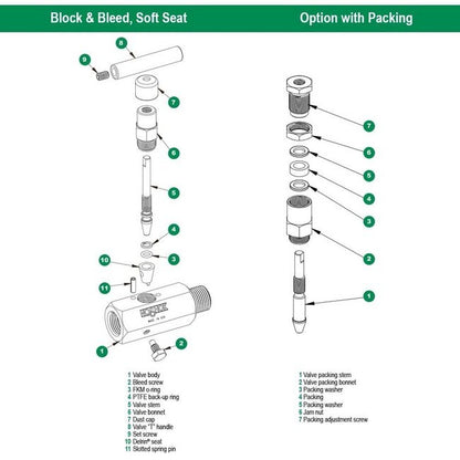 Blow-out proof stem provides a secondary stem seal in the full open positionFKM o-ring seal and PTFE back-up ring below the stem threads to protect from corrosion and galling; PTFE packing optionalAll stem threads are rolled for strength and ease of operationOne-piece bonnet with a metal-to-metal seal to the valve body below the bonnet threadsSlotted spring pin to prevent accidental looseningVinyl dust cap for bonnet and stem (non-packing)0.090" bleed hole located on the bottom is controlled by a 1/4"-20 UNF-2A bleed screw