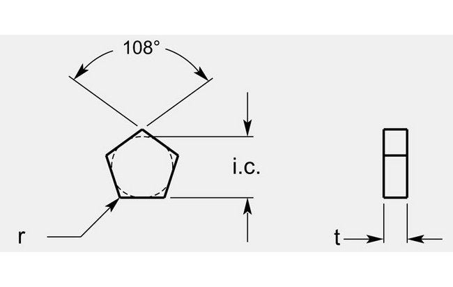 The Precision Negative Pentagon milling blanks offer exceptional accuracy and durability for industrial machining needs. With a thickness of 0.135 / 0.143 inches, an Inscribed Circle ranging from 0.514 to 0.520 inches, and a precise 108-degree Angle, these blanks ensure consistent performance. Grade availability can be tailored to meet specific requirements, ensuring optimal results for your projects. Manufactured to meet stringent quality standards, these blanks are ideal for both consumer and institutional buyers seeking reliability and precision in their machining operations.