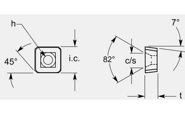 The Premium Square Positive Chipbreaker with Hole and Countersink offers exceptional precision with a thickness of 0.200 / 0.206 in. Designed for milling applications, this chipbreaker features an Inscribed Circle of 0.514/0.520 in, an Angle of 82°, and hole dimensions of 0.198 / 0.202 in. Its C/S measures 0.289 / 0.295 in. Available in Grade options upon request, this chipbreaker ensures high-performance and reliability in machining processes, meeting stringent industry standards.