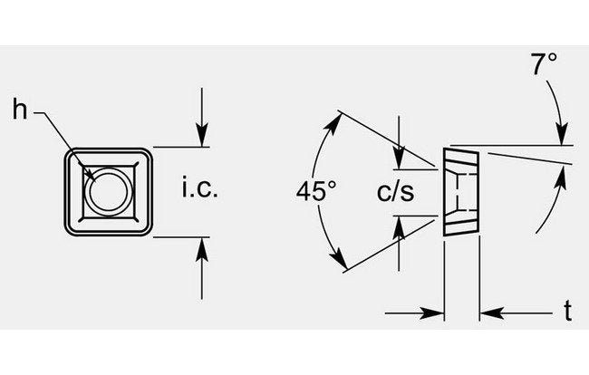 The Premium Square Positive Chipbreaker with Hole and Countersink offers precision with a thickness of 0.212/0.218 inches, an Inscribed Circle of 0.514/0.520 inches, and an Angle of 45 degrees. Designed for milling applications, this chipbreaker ensures efficient performance and consistent results. Available in grades tailored to meet specific requirements upon request.