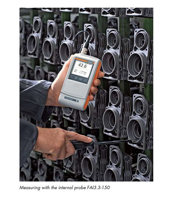 NoteThis document describes probes with electromagnetic measuring methods, which are most frequently used for coating thickness measurement. FISCHER also offers probes for material testing, e.g. for measuring the electrical conductivity or for the determination of the ferrite content. You can find a description of these probes for material testing in the documents of the corresponding measuring instruments.Solutions for individual measurement tasksWe offer the ideal probe for each individual measurement task. FISCHER engineers develop customer-specific probe constructions on demand, like the cavity probe V3FGA06H. This probe was specially designed for non-destructive measurements of EPD coatings within the box section of auto bodies - without having to cut the auto body itself.The extensive selection of FISCHER probes is as versatile as the measurement applications of our customers. After years of continuous development and innovation, the FISCHER probe program now encompasses some 100 probes designed to ensure optimal results for the widest range of measurement applications.Probe selection based on several criteriaMaterial combination of coating and base materialThickness of coating and base materialDimension of the measurement areaShape of the specimenSurface condition of the measurement areaISO 9001In keeping highest standards of quality and customer satisfaction, all members of the FISCHER Group are certified according to ISO 9001.FISCHER Germany is accredited as a DAkkS calibration lab for the measured quantity "mass per unit area" according to DIN EN ISO/IEC 17025.Quality monitoring on engine pistons after the manufacturing process using the FTA3.3H probeAuto body in section to show how the probe measures the EPD coating within the auto bodyMeasuring with the internal probe FAI3.3-150