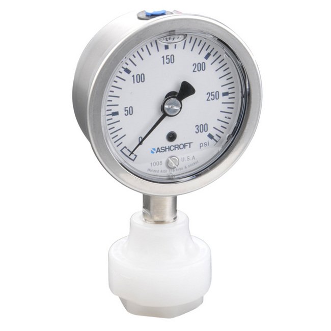 PVDF Mini Tuff Gauge Isolator with Ashcroft 1008s Gauge, 0-15 PSI, 2.5% Accuracy