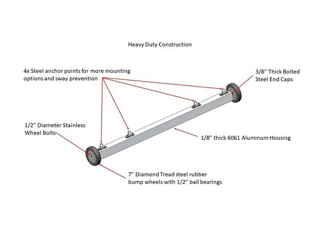 Packed end to end with permanently charged Grade C8 magnets (unspaced).Rugged Durability and construction with 1/8" thick 6061 Aluminum housing that won't rust if left outside.Available in 6 different sweeping widths from 3 to 8 feet.Wrap Around Feature to hold onto debris.Comes with 4 stabilizing chains and 8 quick clips to attach the magnet to your vehicle or equipment.Protective bump wheels on each end to make sure the magnet itself does not hit the ground.Quicker and faster than other methods of picking up metal debris.Replacement parts and accessory Quick Clean Off Sleeves can be ordered on this website if needed.
