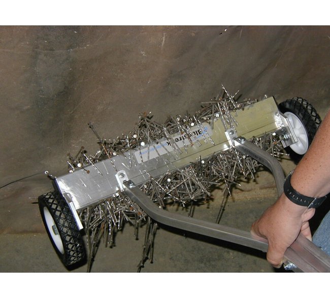 Permanently charged magnets. No replacement or recharging necessary.Sweeping height adjustment. Three adjustment settings to handle any sweeping surface.Available in size; 26".Light weight easy to handle and lift.Solid "Y" handle design, the same as the more expensive models."Wrap Around" feature holds onto nails and debris even if grass tries to wipe it off.Control the sweeping height with 3 wheel height settings to accommodate any situation.Durable and long lasting all weather aluminum housing construction won't rust or deteriorate in wet, damp conditions.Stands upright on its own when not in use, so no stooping over to pick it up all the time and reduces risk of having it accidentally run over by a vehicle.Welded design for extra durability and long life.Quick Clean Off Sleeve makes cleaning off debris fast and easy. Comes standard with the Scape™ Series. Made of durable PVC.
