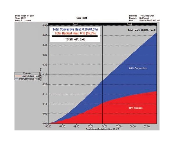 The click of a button transforms 2D Line Graphs into 2D Contour and 3D Mesh only for arrays.The Heat Flux Sensor measures the Total Heat experienced by the product and is conveniently displayed in the Total Heat Graph. The convective and radiant percentages are automatically calculated and displayed on the graph.