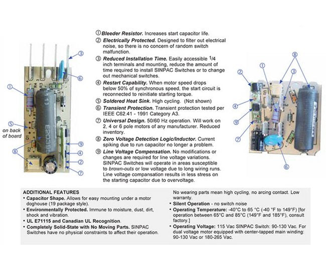 Capacitor Shape: Allows for easy mounting under a motor doghouse (19 package style). Environmentally Protected: Immune to moisture, dust, dirt, shock and vibration. UL E71115 and Canadian UL Recognition. Completely Solid-State with No Moving Parts: SINPAC® Switches have no physical constraints to affect their operation. No wearing parts mean high cycling, no arcing contact, Low warranty. Silent Operation: No switch noise. Operating Temperature: -40 ºC to 65 ºC (-40 ºF to 149ºF) [for operation between 65 ºC and 85 ºC (149 ºF and 185 ºF). consult factory] Operating Voltage: 115 VAC SINPAC® Switch 90-130 VAC. For dual voltage motor equipped with center-tapped mam winding: 90-130 VAC or 180-265 VAC.