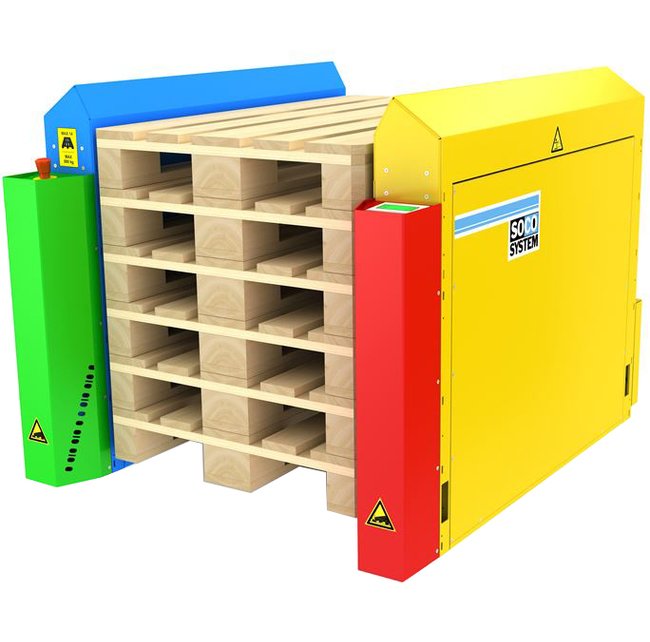 Efficient, safe, and noiseless pallet magazine for up to 24 pallets with a lifting capacity of 2205 lb. Enhances productivity and safety in stacking operations.