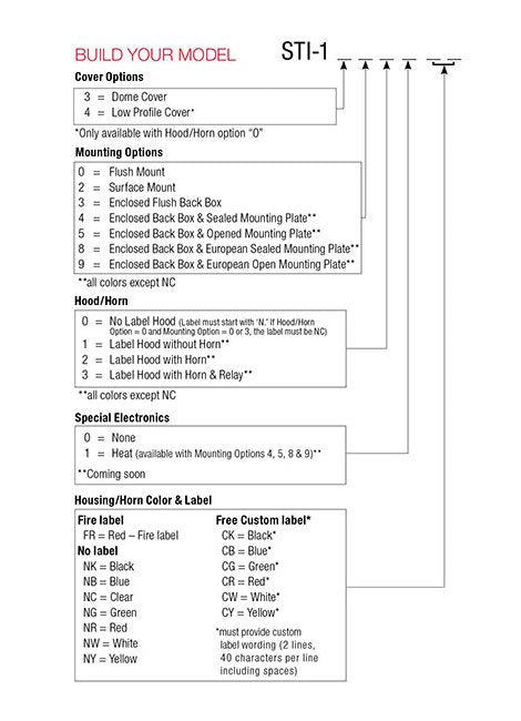 Cover available in low profile or dome shape.Flush frame, surface frame or waterproof back box (with sealed or open internal mounting plate), enclosed flush back box.Locking tab (not for use with fire pull stations).Dome models available with red, green, blue, yellow, white or black label hood/horn housing with custom or no label.Available for red units "In Case of Fire…" label.