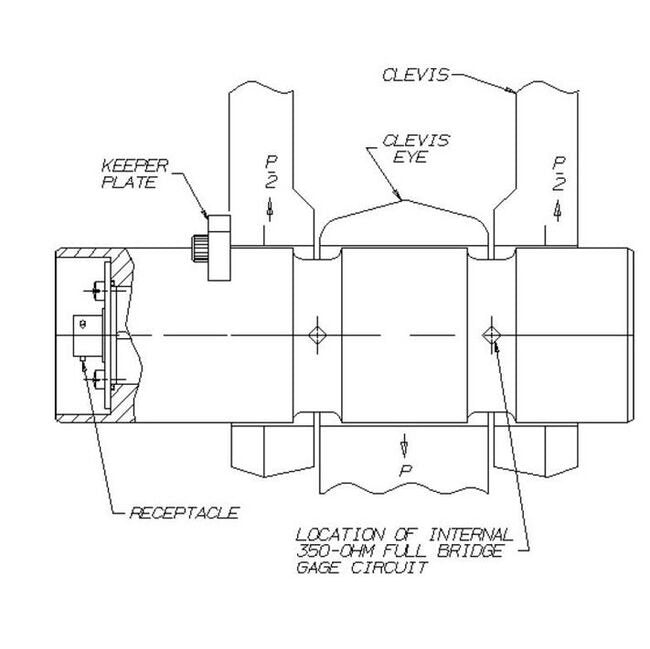 Actuator/Hydraulic Cylinder Load Pins are strain gage transducers developed by Strainsert (U.S. Patent No. 3,695,096). They are manufacured utilizing the internal strain gage process perfected by Strainsert since 1960. We offer precision force measurement by simply replacing existing hydraulic cylinder load pins.The design is a double-shear arrangement. Typically, force P is applied at the center of the pin while 2 equal opposing forces of P/2 are applied at each end. Strain gages are sealed inside a small axial hole and are positioned at the 2 shear locations at the interface between the center eye and pin ends. The strain gages are positioned and oriented with great precision along the neutral plane relative to the specific direction of force.An anti-rotation device is necessary for proper reading and alignment. If a force P is applied to the pin at an angle other than the specified direction, the theoretical bridge output will be offset by a component of the force along the sensitive direction, i.e. P cos X.The four strain gages (two at each shear location) are electrically connected to form a full bridge, the signal from each gage being additive so that the bridge output is proportional to the sum of the forces transmitted by the shear planes of the pin. The circuit typically includes temperature compensation, signal trim (optional), and zero balance resistors terminating in a suitable connector socket or integral cable, and potted with a sealing compound inside the gage hole for enhanced environmental protection.Standard models include detailed calibration data up to 500,000 lbs. Higher capacity calibration data is available at an additional charge. Strainsert factory calibrations are intended to simulate installed conditions, however, it is recommended that an in-place calibration be performed to account for any installation, tolerance, and/or alignment influences affecting sensor measurement.Standard models are typically used in new applications where the designer can develop the specific load pin joint around the standard load pin dimensions, to optimize force measurement performance. In addition, the standard load pin may fit or can be incorporated through the use of bushings or modification of the assembly.
