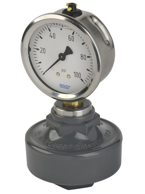The Marquest Gauge Isolator provides two fluid chambers separated by an impermeable membrane. The upper chamber (instrument side) is normally filled with a stabilized liquid. The lower chamber receives the media under pressure. Most pressure sensing devices are compatible with 1/4" FNPT outlet. The inlet is standard 1/2" FNPT or 1/4" FNPT. Chemical resistance and purity levels are as recommended for the base materials. No lubricants are used in construction, internally or externally. Custom membranes may be supplied upon request.