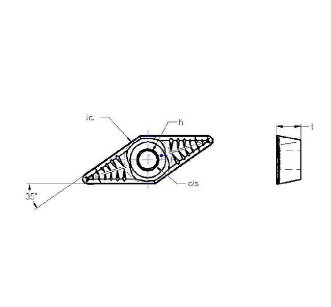 Enhance your machining precision with the Ultra-Met 55º Diamond Positive Aluminum Top Form Cutting Tool Inserts. Crafted for durability, these inserts feature a 55º angle for optimal performance. Made from high-grade aluminum, they offer exceptional dimensional specifications: Inscribed Circle (i.c.) ranges from 0.518 to 0.524 inches, Thickness (t) from 0.278 to 0.284 inches, Hole (h) from 0.200 to 0.206 inches, C/S from 0.237 to 0.243 inches, and Radius (r) at 0.058 inches. Meet your cutting needs with precision and reliability.