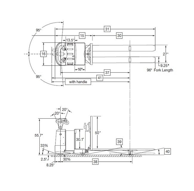 Multi-function LCD display with:PIN accessSelectable performance modesBDI and speedometerOn-board diagnostics and troubleshootingMagnetic mount convenience tray with stretch wrap holderElectric coast controlFork auto-lift function to 2-1/2" height upon release of lower buttonOn/off toggle switch (Available at no charge.)Fixed steer head (Available at no charge.)Operator compartment knee padBattery compartment rollers with side gatesBattery gate interlock switchesTravel alarmStainless steel axles and linkage pivot pinsVulkollan® load wheelsNon-marking rubber, traction treaded rubber or flat poly drive tire options