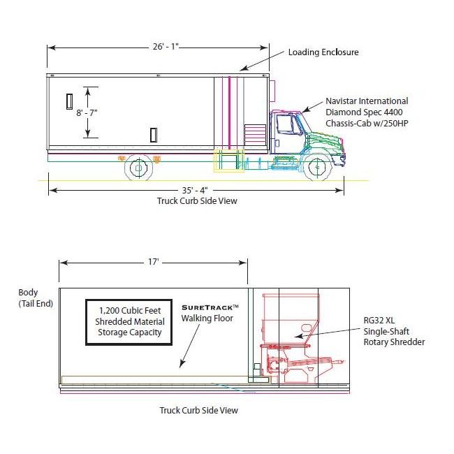 Body Constructed of space-age material that is both lightweight and stronger than steel. Securely designed and with room for extra bins.Highest Shredding Efficiency and payload capacity of any other 33000 GVWR shredding vehicle.Latest Design in bin loading. The Lock ‘n’ Load™ Bin Lifter System developed jointly by Vecoplan® and Toter®, Inc. and the EasyAccess™ Loading Enclosure lifts and dumps at curb level without dust or safety issues. The SureTrac™ Gliding Floor payload discharge system makes discharging quick and safe. These developments allow for automatic loading, shredding, compaction and discharge, effortlessly with no manual intervention.Power Generation, for the process equipment, is accomplished by using the latest in PTO-hydraulic components; a simple, powerful and seamless interface.Single-Station, graphic touch screen control console for operation and monitoring of process functions.Absolutely The Most comprehensive and longest warranties in the industry.New laws, confidentiality concerns, awareness of risk management and accountability, enforcement of information security/ID theft laws and corporate desires to prevent illicit sales of their products are ever-increasing. To help capitalize on this business opportunity, Vecoplan®, the innovative leader in advanced off-site shredding systems, now puts the same innovation to work in its Mobile Document and Product Destruction Systems. Learn how Vecoplan®’s On-Site Shredding Vehicle can benefit your operation.