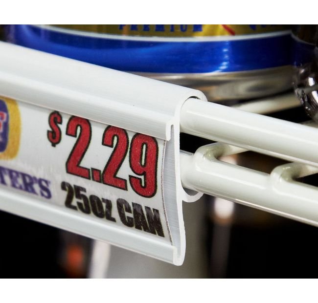 The White Double Wire Shelf 'C' Channel is a versatile solution for displaying pricing or advertisements on cooler shelves with parallel front-facing cross wires. Made from durable Polyvinyl Chloride (PVC), this 1-1/4" high channel easily clips onto 7/8" height cooler wire shelves and accommodates 1-1/4" data tickets. Its open face design ensures hassle-free insertion of data tickets, tags, or signs, making it ideal for retail environments. Custom lengths are available to suit specific needs, offering a cost-effective and practical labeling solution.