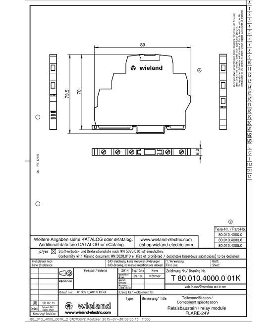 Reliable Wieland 24DC-1W-250V6A Relay Module for industrial use. 1 change-over contact, 24V DC input, 250V AC/6A output. RoHS & REACH-SVHC compliant.