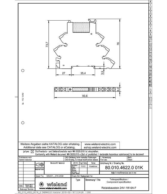 The Wieland 24V-1W-6A-F Coupling Relay Module features a 6.2mm width, plugable design with cage clamp for easy installation. It operates at a nominal voltage of 24V DC and offers 1 change-over contact rated at 250V AC / 6A. This relay module is designed for precise control and reliability, suitable for various applications. With RoHS and REACH-SVHC conformity, it meets stringent environmental standards.