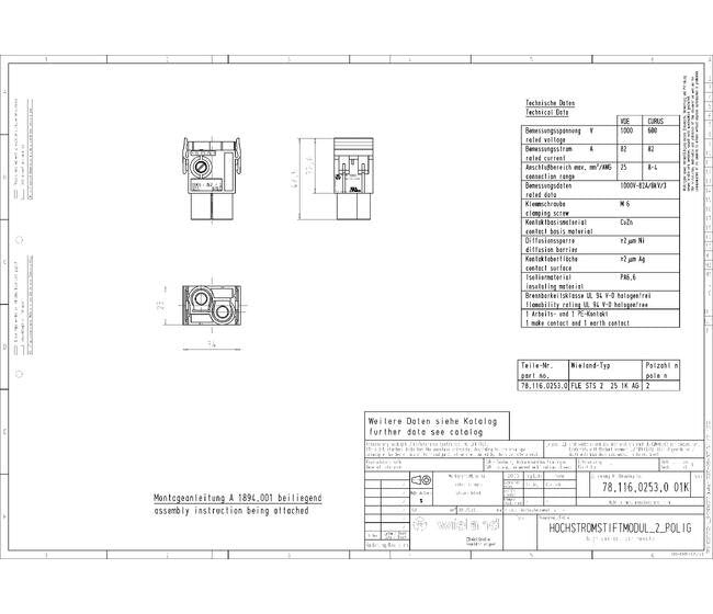 The Wieland Pin High Current Industrial Connector Insert is a premium modular connector system designed for industrial applications. This 2-pole female insert boasts a maximum rated voltage of 600V and a rated current of 82A, ensuring reliable power connections. With a robust screw connection, copper alloy contacts with silver-plating, and V0 inflammability class insulation material, this connector insert offers exceptional durability and performance. Additionally, it meets RoHS and REACH-SVHC conformity standards, providing a reliable and environmentally conscious solution for high-current connectivity needs.